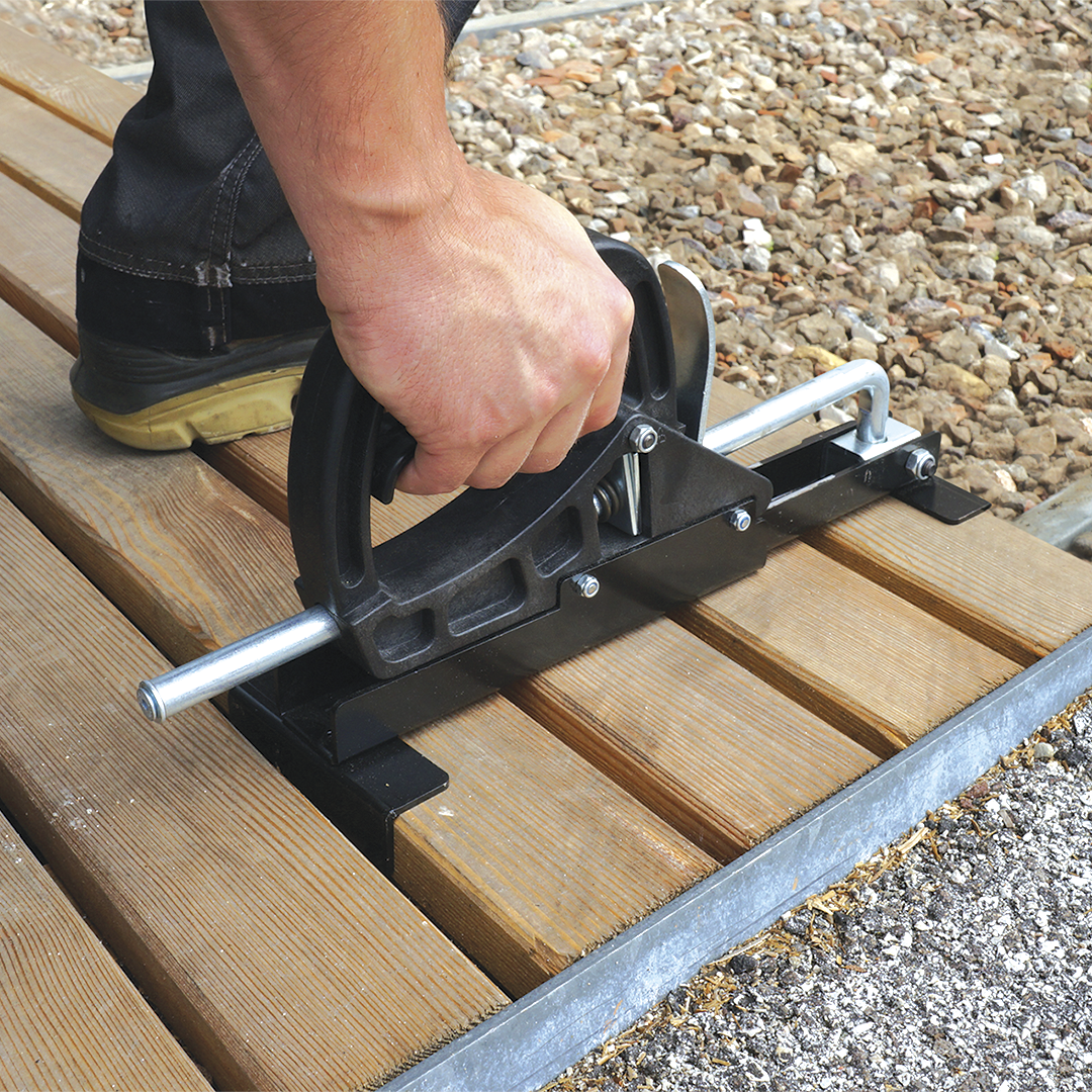 La presse pour terrasses CRAB MINI est l’outil idéal pour disposer les lames lors de la réalisation de terrasses en bois.