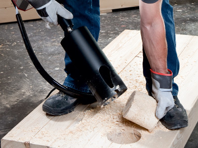 La scie cloche LB est conçue pour des perçages profonds, avec une profondeur de coupe de 300 mm | 12 pouces, également adaptée aux éléments en bois les plus épais et aux panneaux multicouches.