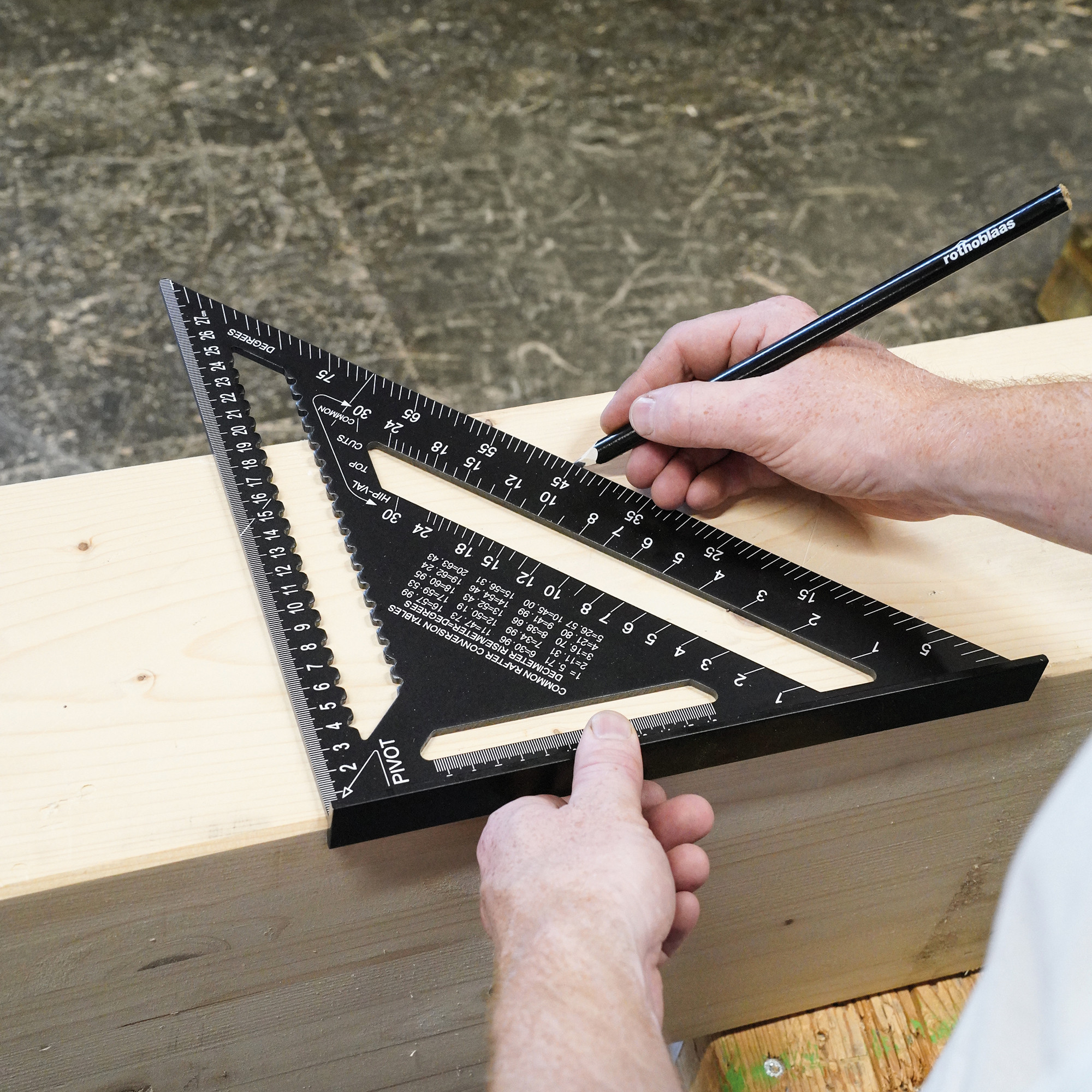 • Équerre multifonction, légère et robuste : règle, équerre de butée, équerre oblique, rapporteur, guide de marquage, guide de scie et lame pour chevrons