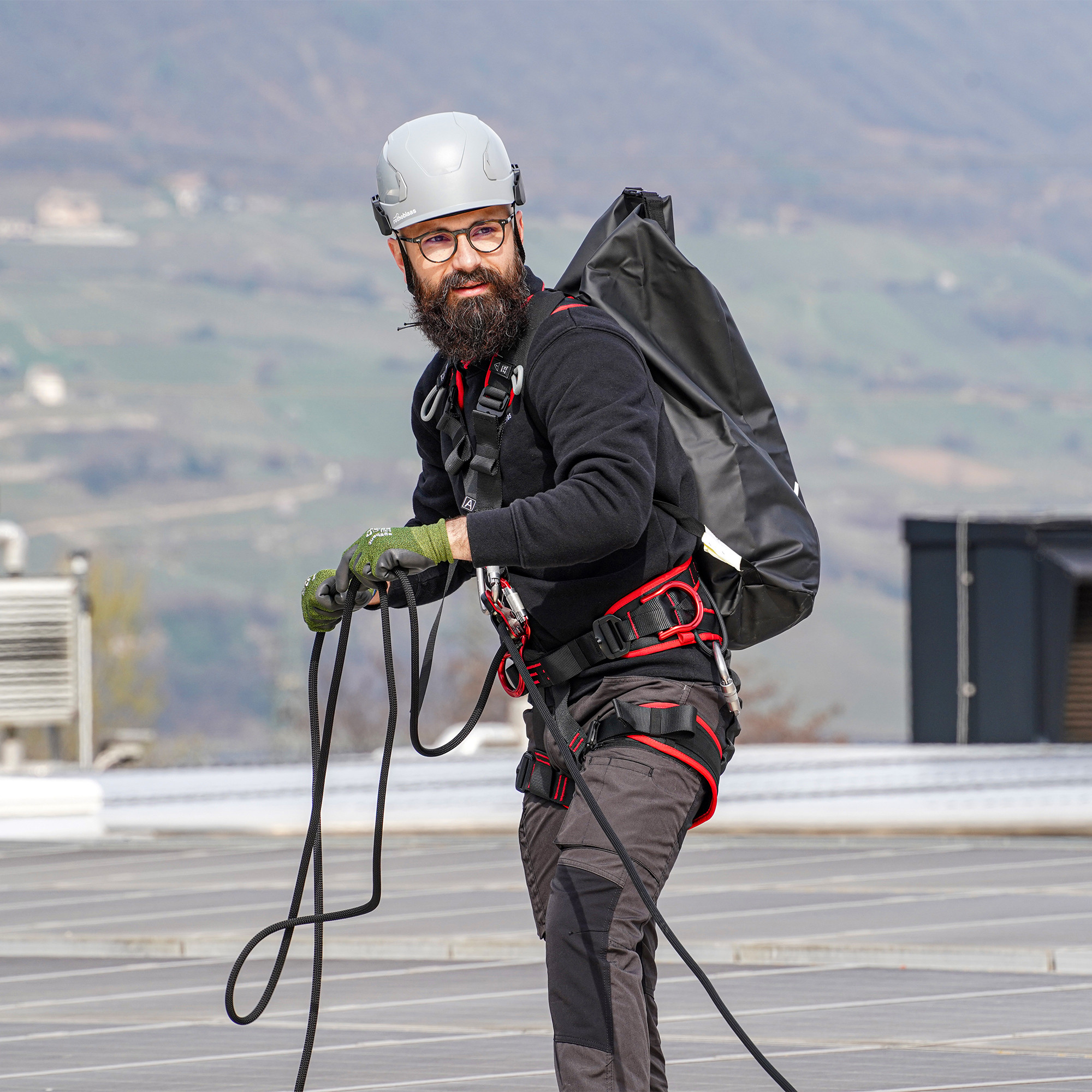 ROOF PRO est le kit antichute professionnel pour le travail sur toiture qui comprend le harnais complet antichute et de positionnement SPARTA, la corde semi-statique ROPE1 avec mousqueton autobloquant de 15 mètres de longueur et le dispositif antichute guidé amovible BACK.